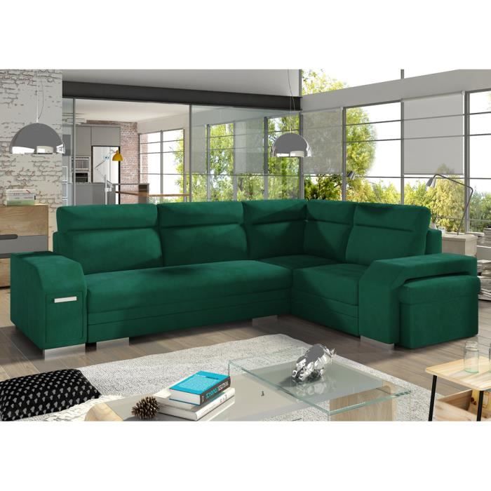canape d angle convertible droit umill l tissu monolith 37 vert bouteille avec minibar et pouf cdiscount maison