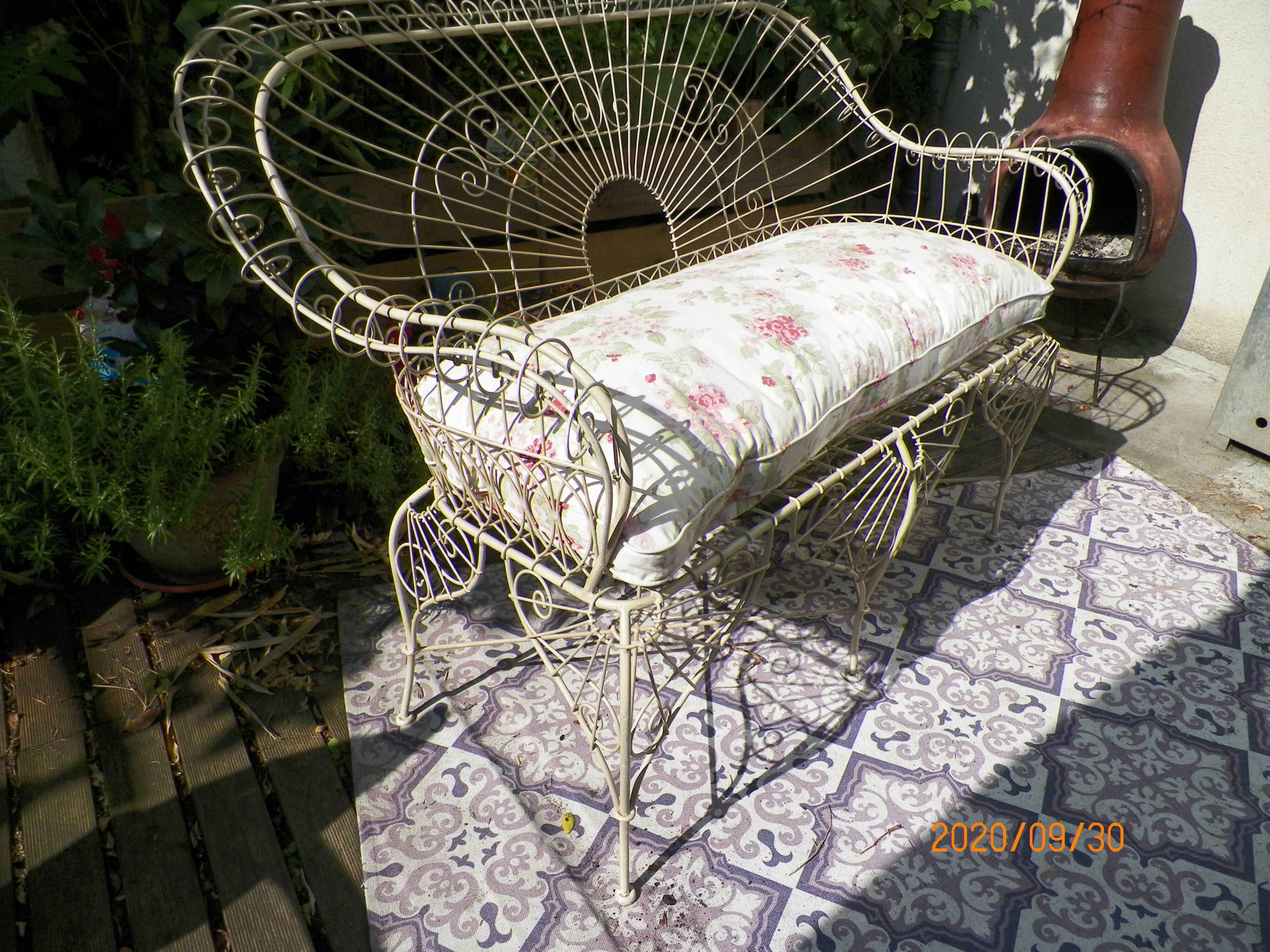 banquette en fer forge style anglais avec son coussin fleuri dehoussable selency
