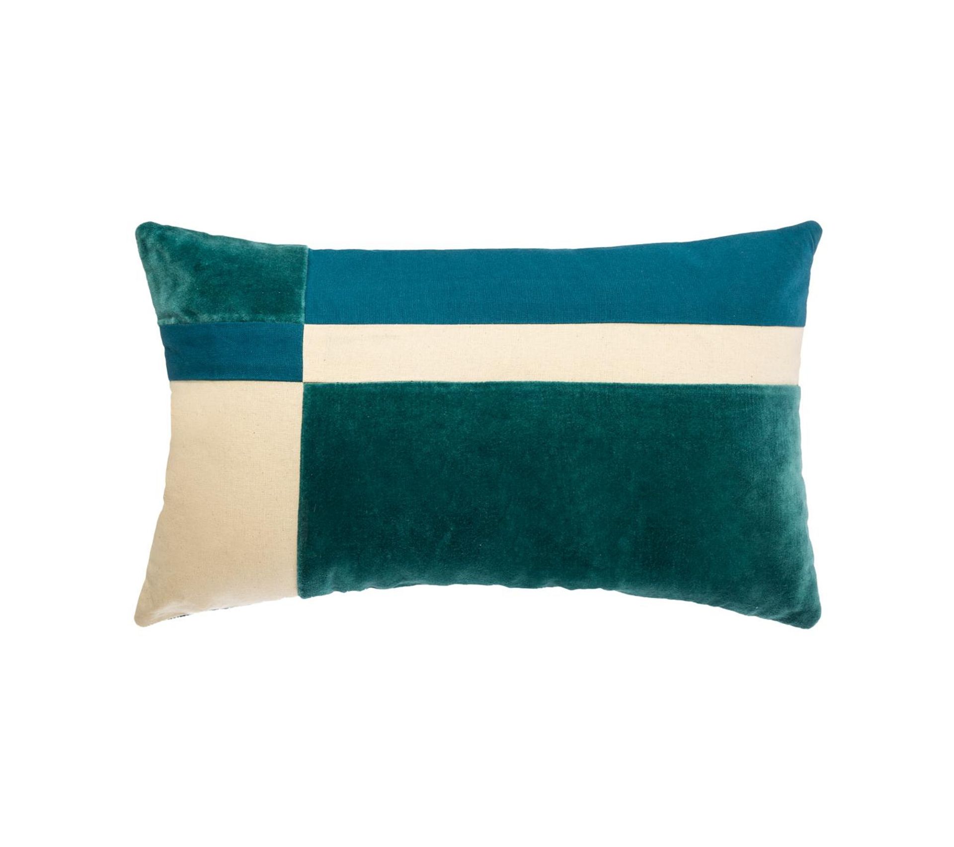 coussin dehoussable patchwork en velours bleu et coton canvas 50 x 30 cm coussin but
